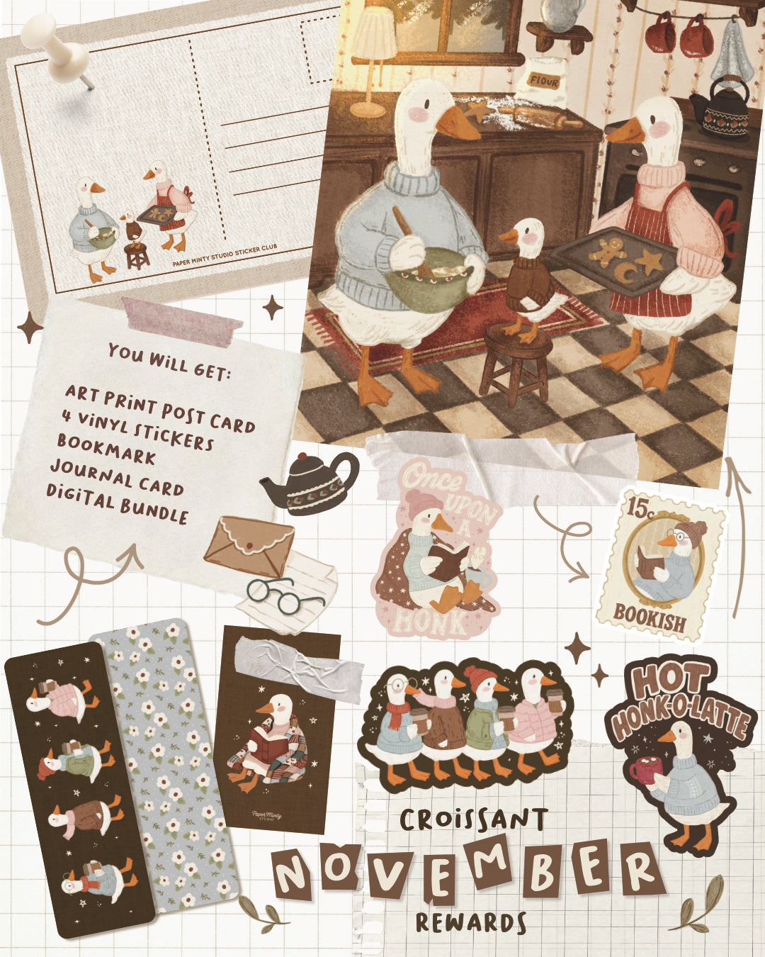 This month’s Croissant rewards were straight out of a storybook: cozy geese, warm colors, and lots of honk-worthy details! I wanted this nostalgic theme to transpire into a cozy warm holiday season!